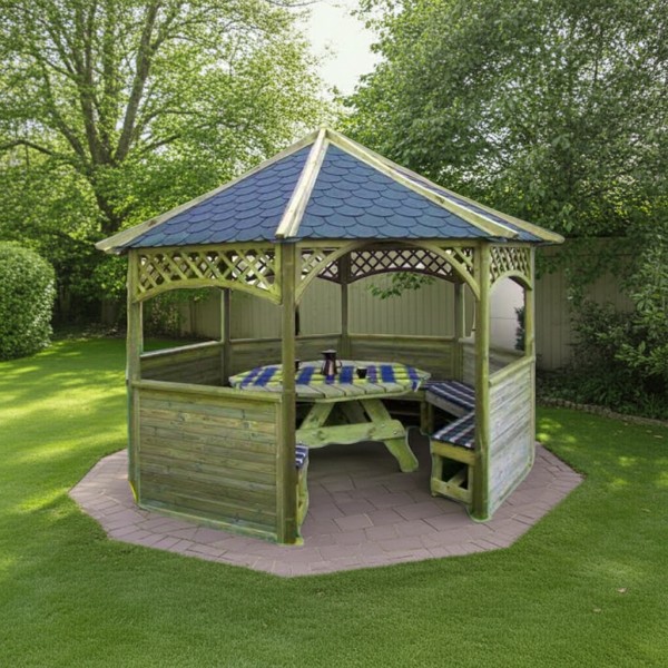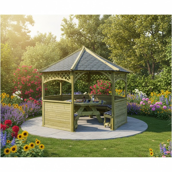 Altana ośmiokątna Gerda w zestawie B może stanowić miejsce do komfortowego wypoczynku na działce czy w ogrodzie. Można schronić się w niej, kiedy pogoda nie pozwala na przebywanie na łonie natury, zoorganizowac w środku letnie przyjęcie, czy spożywać posiłki w gronie najbliższych. Ta altana ogrodowa to konstrukcja nie tylko praktyczna, ale też bardzo atrakcyjna wizualnie dzięki ciekawemu kształtowi oraz dużym otworom okiennym.