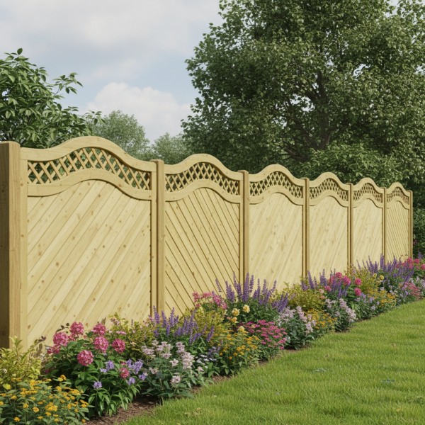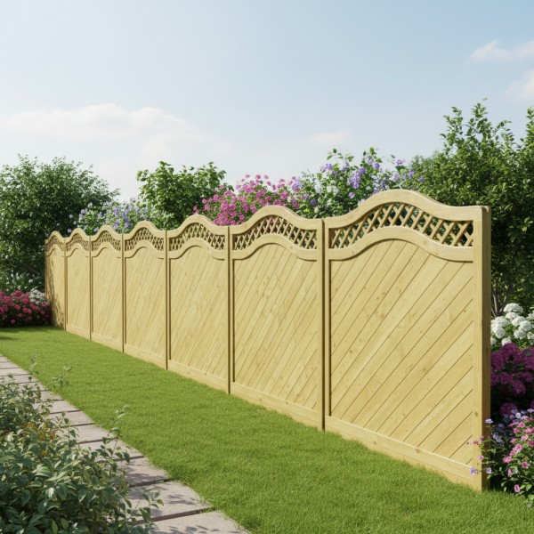 Płot Nicole rama 44x88mm wypełniony jest diagonalnie ułożonymi listwami boazeryjnymi łączonymi systemem pióro-wpust, które zwiększają jego walory estetyczne i gwarantują najwyższą jakość. W górnej części wypełnieniem jest subtelna kratka zakończona u góry i dołu ozdobnymi łukami w kształcie Omega. Płot gwarantuje doskonałą przesłonę Twojej posesji, ogrodu lub patio. Jego konstrukcja jest wystarczająco solidna (pogrubiana rama), aby mógł byc wykorzystany jako samodzielne ogrodzenie - za pomocą łączników kątowych i kompletu wkrętów przykręcamy go do kantówek-słupków (Z POWODU MASYWNOŚCI PŁOTU ZALECA SIĘ ZASTOSOWANIE KANTÓWEK O PRZEKROJU 9 x 9cm) zakotwiczonych w gruncie za pomocą odpowiednich kotew wbijanych/podstaw słupka lub stop słupka (wszystkie akcesoria również dostępne w naszym sklepie). Jego zaletą jest masywna konstrukcja w przystępnej cenie, łatwy i szybki montaż (demontaż), estetyczne wykończenie, bardzo szeroki wybór rozmiarów ułatwiający optymalne wypełnienie przestrzeni.