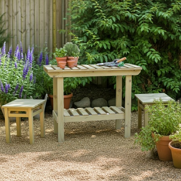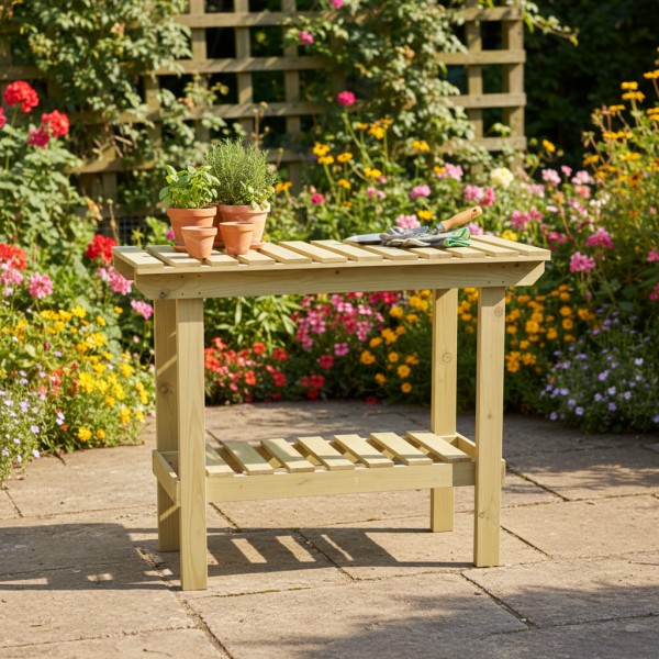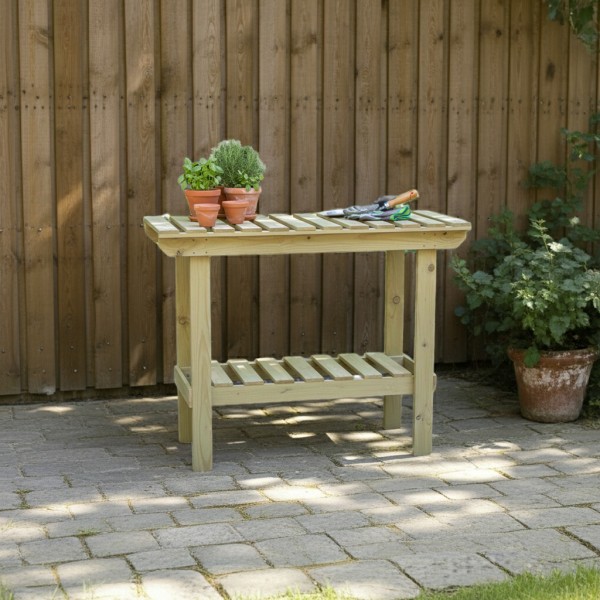 Prosta, stabilna konstrukcja oraz dodatkowa dolna półka zwiększają praktyczność mebla, zapewniając miejsce na doniczki, narzędzia ogrodowe czy akcesoria. Naturalny wygląd drewna sprawia, że drewniany stolik ogrodowy doskonale komponuje się z zielenią i aranżacją przestrzeni wypoczynkowej.