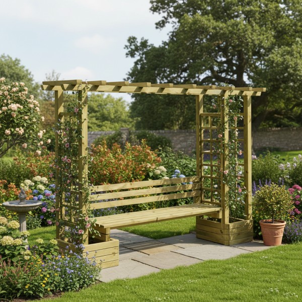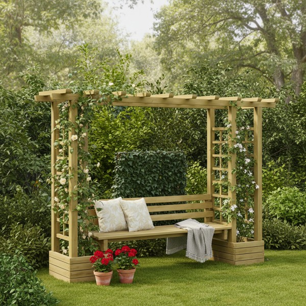 Pergola kombinowana prosta to idealny produkt dla osób lubiących usiąść i odpocząć w ogrodzie, porozmawiać z przyjacielem lub poczytać ulubioną książkę. Jej konstrukcja pozwala na ustawienie bezpośrednio na podłożu. Po bokach dołączona jest konstrukcja z donicą, w której można posadzić efektownie pnące się po kratkach rośliny. Jej zaletą jest estetyczne wykończenie, stabilna i masywna konstrukcja.