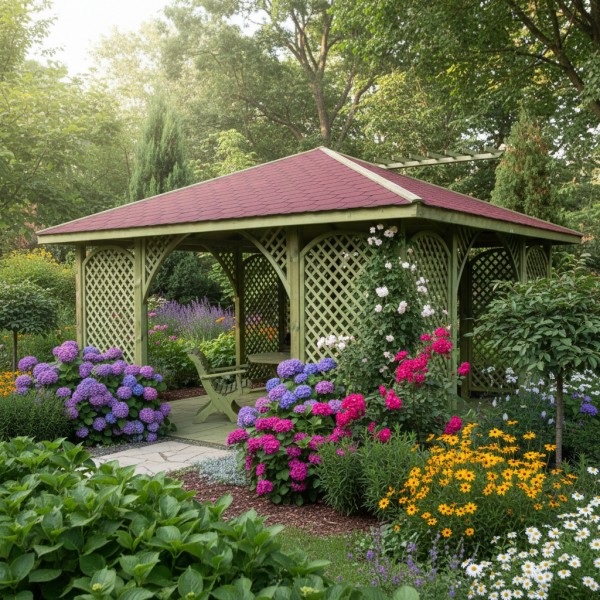 Altana Romantica z dachem drewnianym to jedna z największych propozycji altanowych w naszej ofercie, dzięki dość dużym rozmiarom zapewnia optymalną wygodę dla grupy nawet ok. 12 osób. Z poszczególnych stron możemy altanę dodatkowo przesłonić, wstawiając w wejścia dowolne płotyosłonowe z naszej oferty o szerokości 180cm.