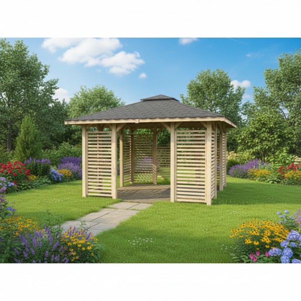 Nowoczesna Altana ogrodowa Sara 4-kątna z drewnianym dachem (słupki 9x9cm) jest idealnym miejscem do odpoczynku, spożywania posiłków na świeżym powietrzu, spotkań ze znajomymi i rodziną. Dzięki dość dużym rozmiarom zapewnia optymalną wygodę dla grupy nawet ok. 10 osób. Organizacja spotkania nawet przy dość silnym słońcu lub nawet przy małym deszczu nie bedzie stanowiła problemu.