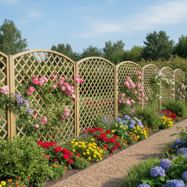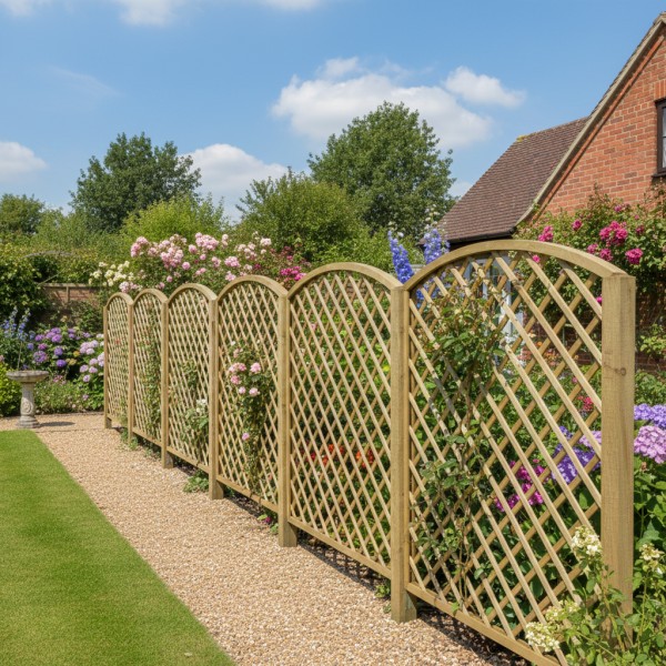 Płot Lidia w całości wypełniony jest skośnymi listewkami heblowanymi umieszczonymi w solidnej ramie, zamkniętej łukiem u góry. Płot można zastosować jako wewnętrzną prześwitującą przegrodę w ogrodzie, patio, lokalach gastronomicznych lub jako stabilne oparcie dla Twoich pnączy. Jego stabilność jest wystarczająco solidna, aby mógł byc wykorzystany jako samodzielna konstrukcja - za pomocą łączników kątowych i kompletu wkrętów przykręcamy go do kantówek (słupków) zakotwiczonych w gruncie za pomocą odpowiednich kotew wbijanych/podstaw słupka lub stop słupka (wszystkie akcesoria również dostępne w naszym sklepie). Jego zaletą jest przystępna cena, łatwy i szybki montaż (demontaż), estetyczne wykończenie, bardzo szeroki wybór rozmiarów ułatwiający optymalne wypełnienie przestrzeni.